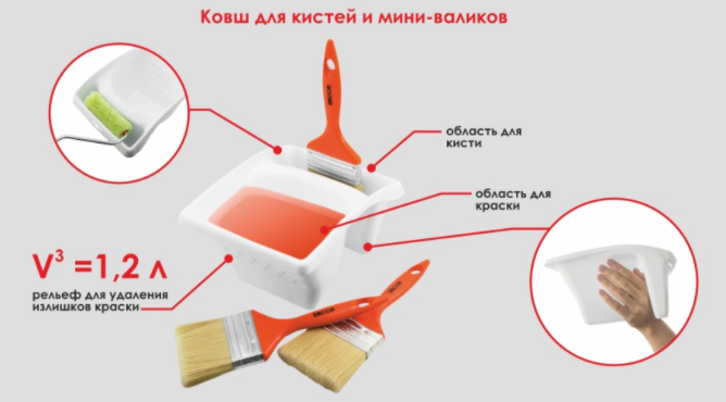 Ёмкости для краски, клея и растворов: ковши, ванночки, вёдра.Ковш для краски белый с областью хранения для мини-валиков и кистей до 100 мм.