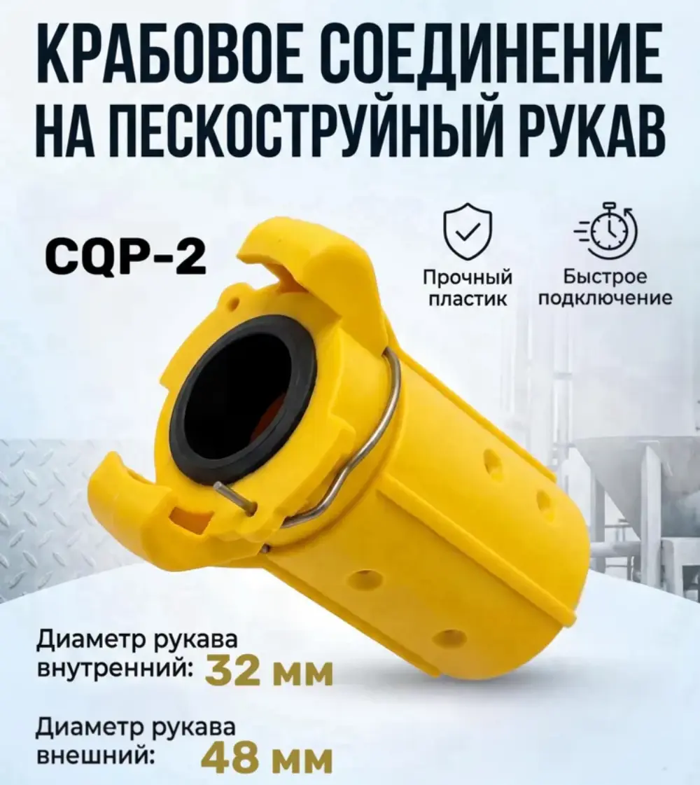 Соединение крабовое на пескоструйный рукав 32х48 мм CQP-2Крабовое соединение изготовлено из пластика, предназначено для крепления на воздушные и пескоструйные шланги и служит для качественного соединения двух и более отрезков рукавов, а также подключения к пескоструйной установке.