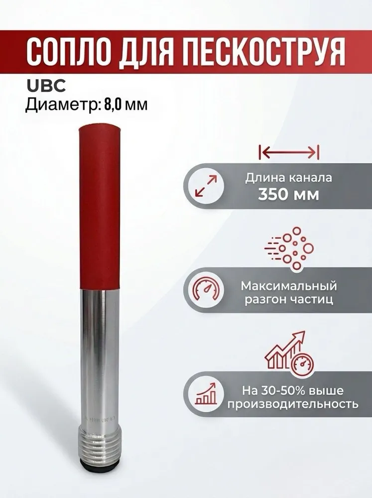 Сопла Вентури UBC XL обладают увеличенной длиной рабочего канала, что позволяет увеличить скорость воздушно-абразивной смеси, тем самым увеличивая производительность и эффективности пескоструйных работ до 50 % по сравнению с стандартными соплами Venturi UBC.