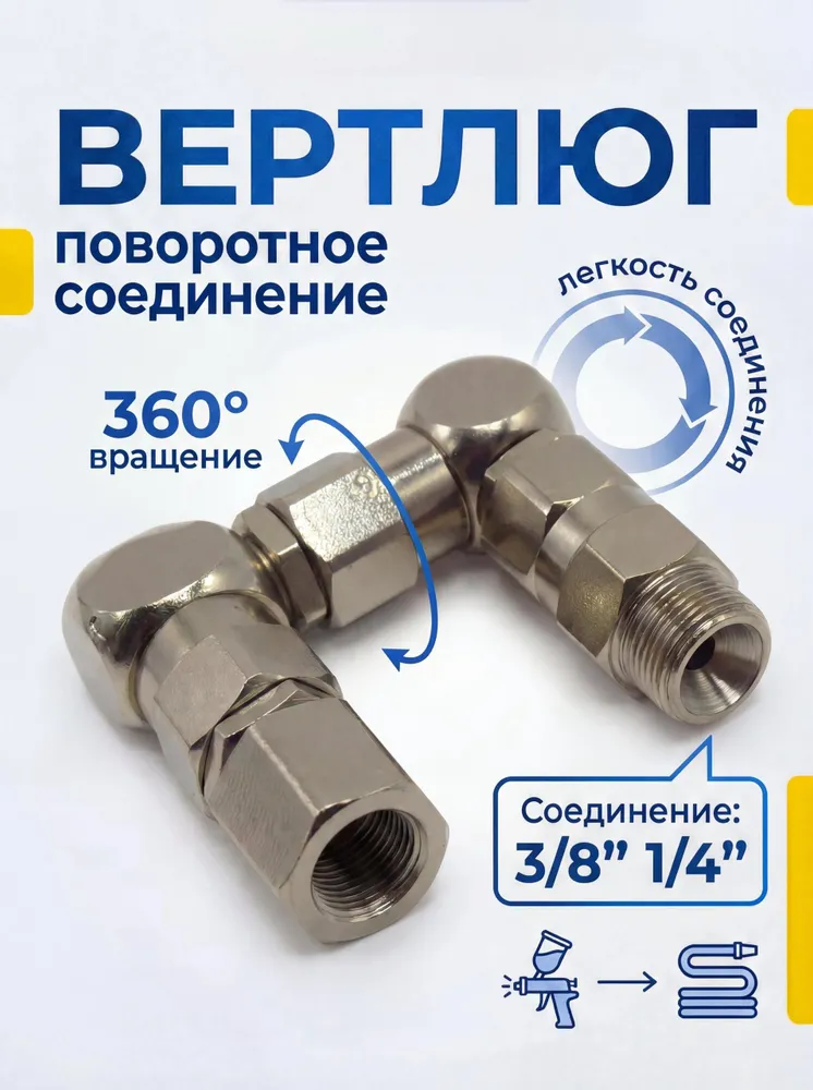 Вертлюг для окрасочного пистолета 3/8" 1/4" Dino-power предназначен для безвоздушного высоконапорного распыления краски. Подключение формируется между пистолетом и шлангом. Вертлюг поддерживает герметизацию высоконапорных линий и обеспечивает полнофункциональное вращательное движение на 360 градусов между шлангом и пистолетом, предотвращающее перегиб шланга при распылении. Изготовлен из нержавеющей стали, не подвержен коррозии, прочный и долговечный в использовании.Шарнирное соединение штуцер 3/8 дюйма с разъемом гайки 1/4 дюйма.